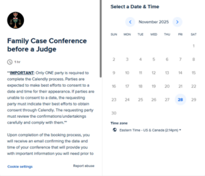 - Access the appropriate Calendly link for the matter you wish to schedule with the court.